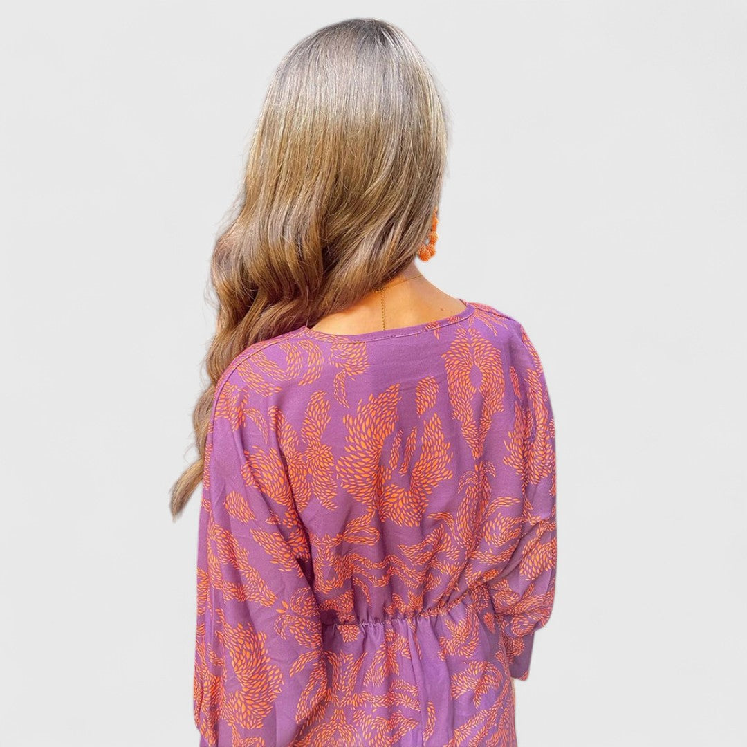 Δημητρούλα - Μίντι Φόρεμα με Στρίψιμο Μπροστά, Βαθύ V-Ντεκολτέ, Μακριά Μανίκια & Παϊσλέ Σχέδιο